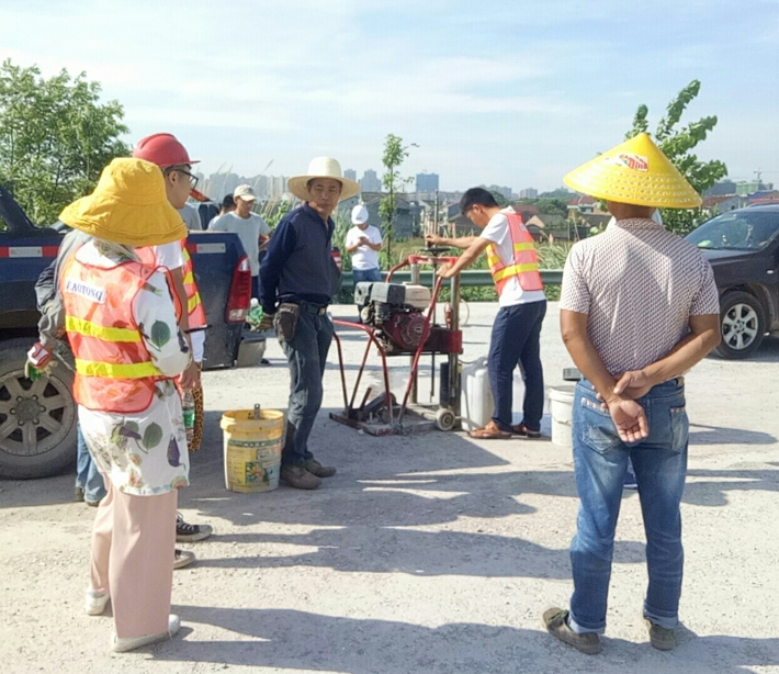 三是檢測(cè)環(huán)境惡劣。從6月份開始茶陵地區(qū)進(jìn)入持續(xù)高溫期,最高溫度達(dá)39℃,路面溫度最高達(dá)到47℃,施工現(xiàn)場(chǎng)驕陽(yáng)似火,熱浪滾滾,衣服濕了又干,干了又濕。