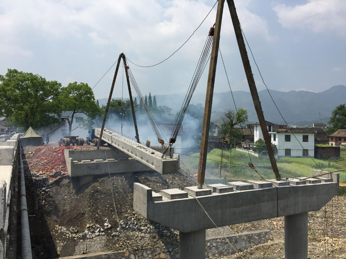4月12日中午12時(shí),位于炎陵縣S347項(xiàng)目新河西大橋建設(shè)現(xiàn)場(chǎng),人字扒桿將一片長(zhǎng)20米、重30.6噸的空心板梁從運(yùn)梁車起吊,在參建人員的歡呼聲和鞭炮聲中,第一片空心板梁歷時(shí)5小時(shí)后平穩(wěn)、安全地安裝在支座上,成功架設(shè)。